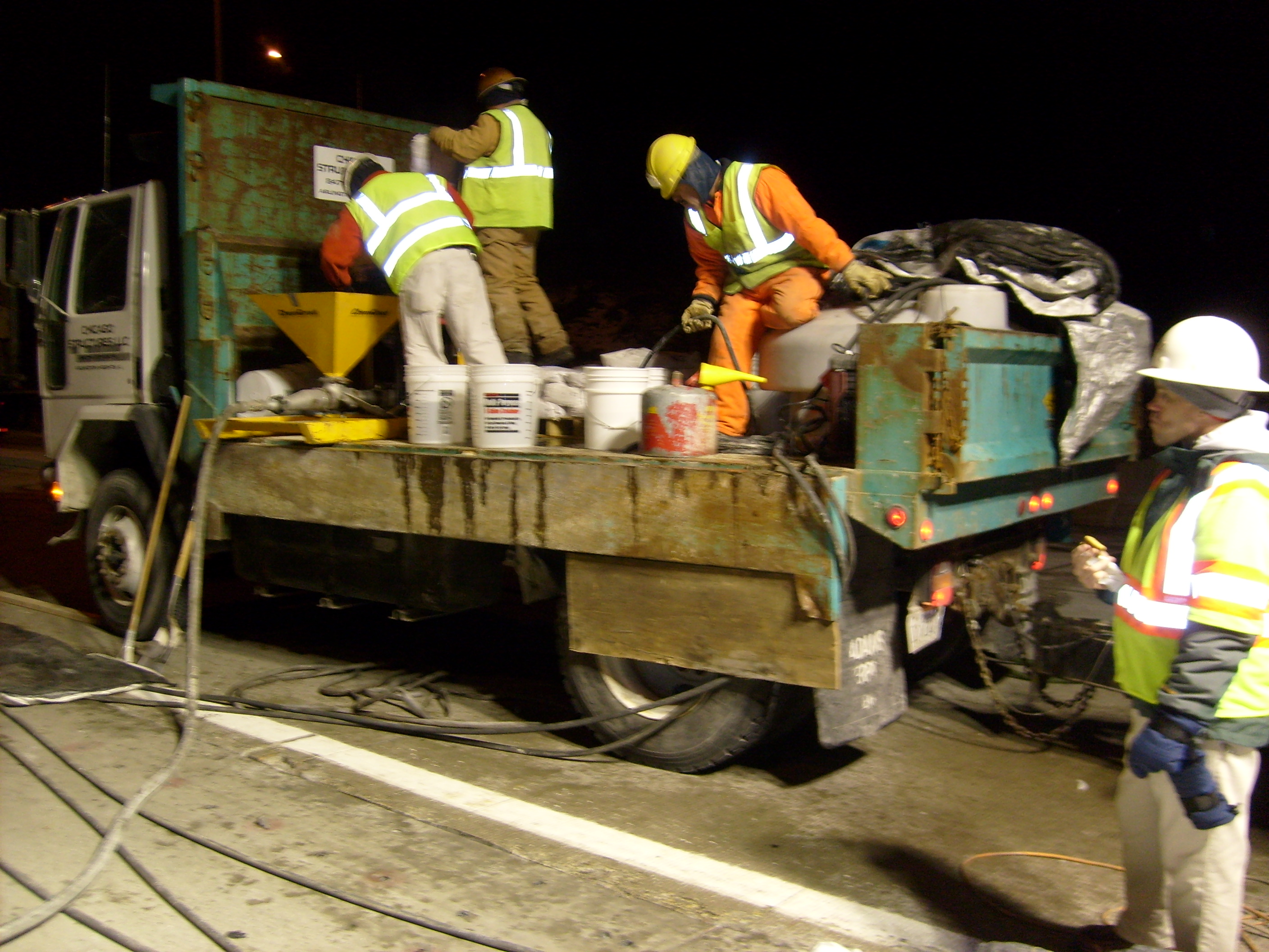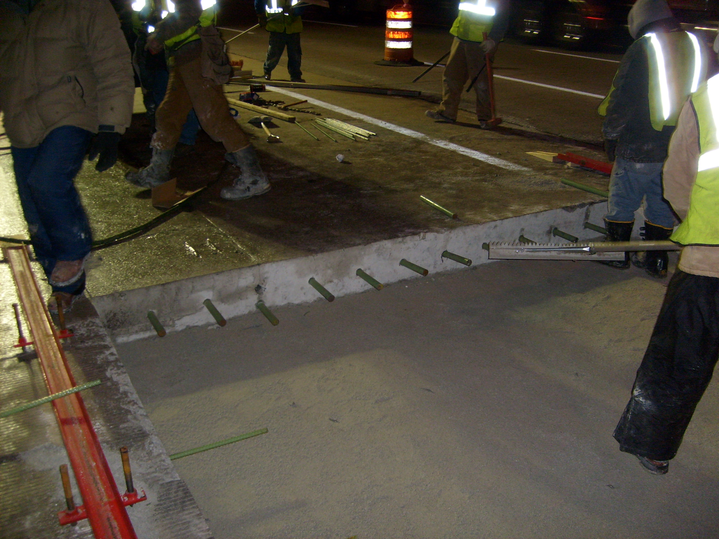 The project consisted of emergency pavement repairs to a gore area (between two travelled lanes) that had broken up and had become a danger to the travelling public. Slabs were installed in extreme cold weather and required special ground thawing equipment for heating the slabs to cure the dowel grout and bedding grout.